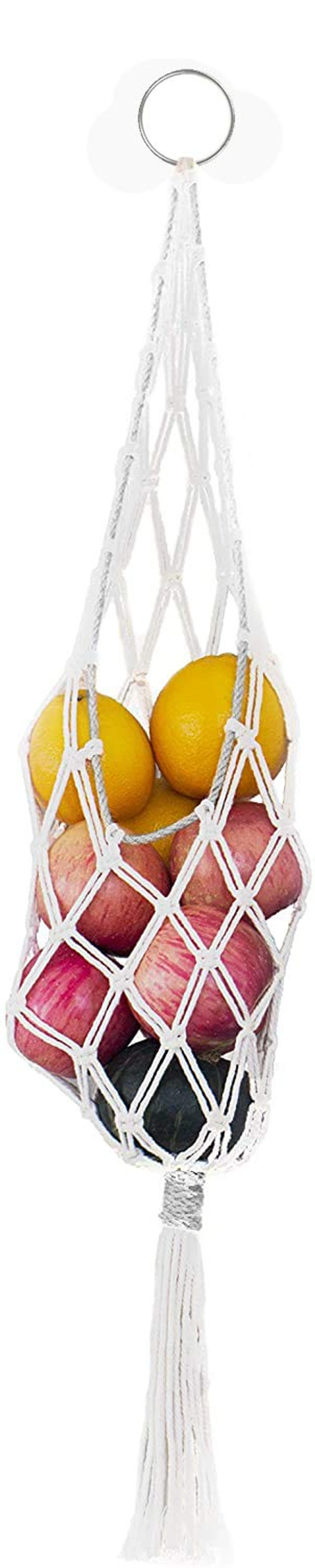 GORGEOUS SPACE SAVER FOR ANY INTERIOR. This refined macrame basket can be hung on the wall or from the ceiling, freeing up counter space or shelf space. It brings some texture and interest to your wall in kitchen, pantry and camper.