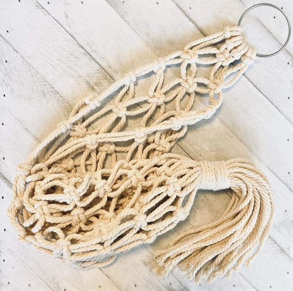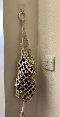 GORGEOUS SPACE SAVER FOR ANY INTERIOR. This refined macrame basket can be hung on the wall or from the ceiling, freeing up counter space or shelf space. It brings some texture and interest to your wall in kitchen, pantry and camper.